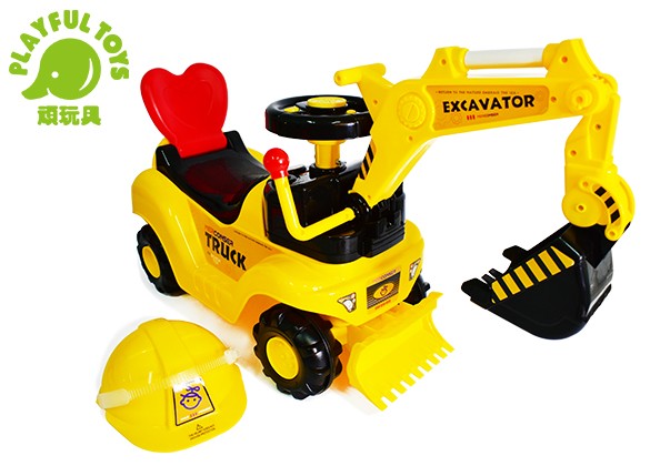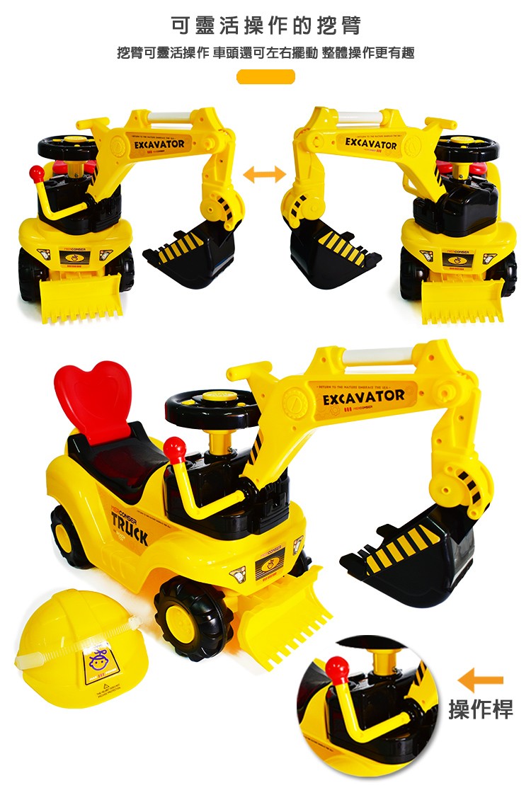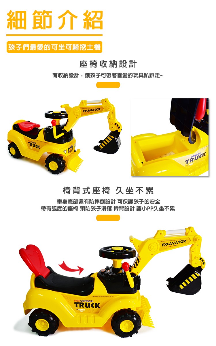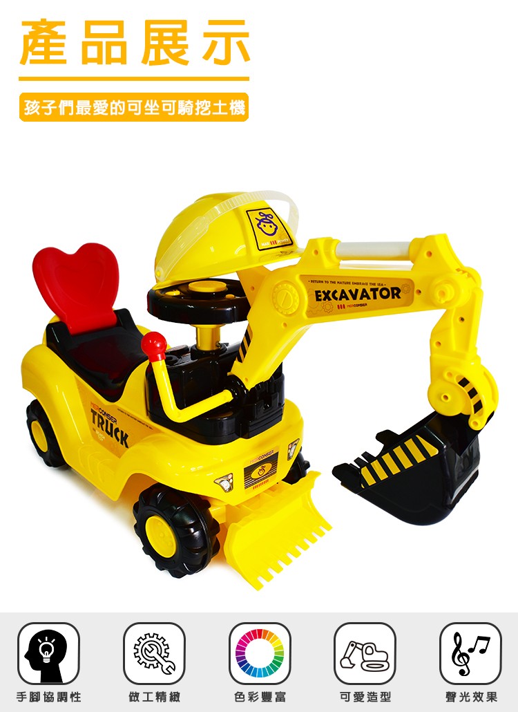 學步騎乘工程車,孩子們最愛的可坐可騎挖土機。車身椅背為愛心造型可支撐孩子背部,