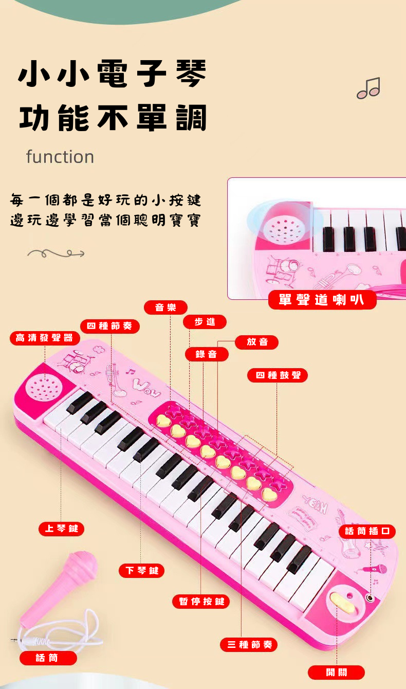 四種鼓聲、錄音回放、單聲道喇叭,還能切換上下琴鍵,玩法百變不膩!