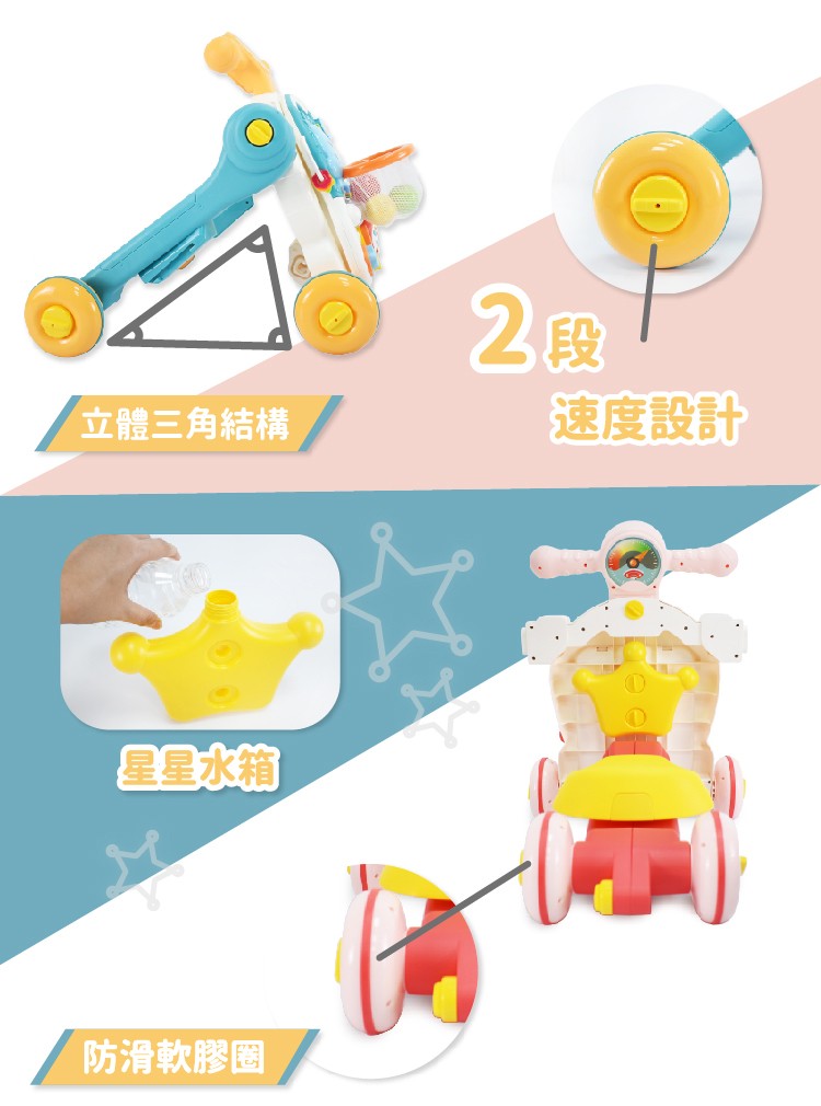 學步車體採用立體三角結構,搭配星星水箱使用,穩固又安全。