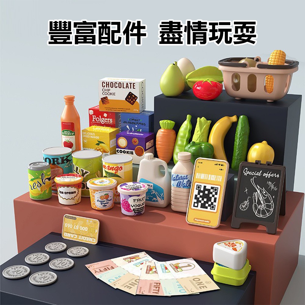 ✅ 67件超豐富配件,玩到天荒地老! 包含蔬菜、水果、飲料、零食、貨幣、信用卡、購物籃等多種仿真食物配件,鼓勵孩子學習分類、整理與角色扮演,培養良好的生活習慣。