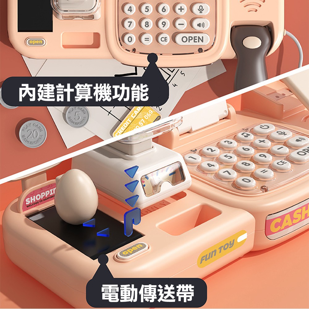 ⚡ 電動傳送帶: 最酷的功能來了!按下開關,商品會隨著電動傳送帶滑入收銀台!這種精緻的互動設計,能有效提升孩子的專注力和對細節的觀察力,讓遊戲體驗直接拉滿!